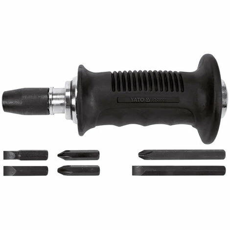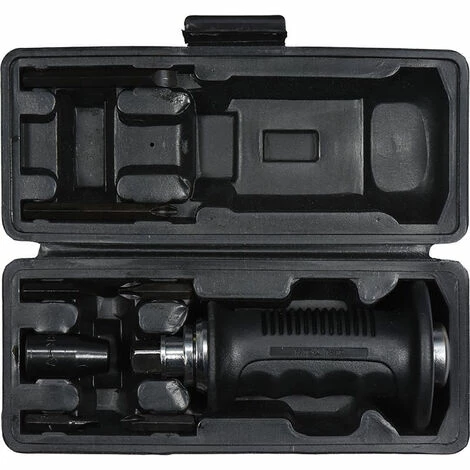 Handlicher YATO-Schlagschrauber mit einem 175 mm langen, ergonomisch geformten Kunststoffgriff und 6 geschwärzten Aufsätzen. Das ideale Werkzeug zum Entfernen und Lösen schwergängiger Schrauben, Bolzen und Muttern. Er funktioniert durch Umwandlung der kinetischen Energie des Hammerschlags in eine Drehbewegung der Schraubendreherspitze. Beim Schlag auf den Schrauber wird die Nuss/der Bit nach links zum Öffnen gedreht.