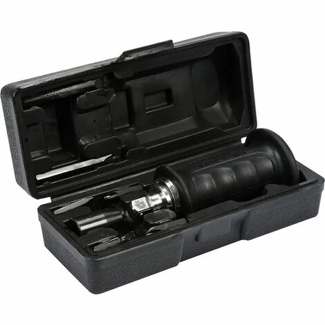 Der Schlagschraubenzieher findet seinen Einsatz in Werkstatt und Hobby. Zum Lieferumfang gehört neben den 6 Bits auch eine praktische Aufbewahrungsbox aus Kunststoff.