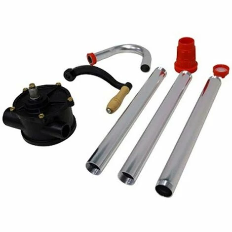 Um die Pumpe benutzen zu können, muss sie in der Öffnung des Laufs befestigt werden, damit sich die Kurbel frei drehen kann. Dazu den Befestigungsring in das Gewinde der Einfüllöffnung einschrauben, dann das Pumpenrohr durchstecken und mit der im Ring befindlichen Schraube verriegeln. Stellen Sie einen Behälter unter die Pumpenauslassöffnung und beginnen Sie mit dem Pumpen durch Drehen der Kurbel.