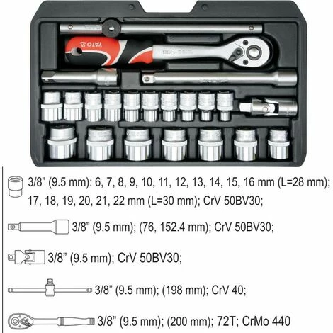 Der 22 teilige Knarrenkasten von der Marke YATO hat ein 3/8″ Ratschenantrieb in Profi-Ausführung und ist für den täglichen Einsatz geeignet. Die Ratsche hat 72 Zähne und die Steckschlüssel sind mit AS-DRIVE ausgestattet welcher den maximalen Drehmoment um 25% steigert. Der Steckschlüsselsatz ist aus hoch legiertem Chrom-Vanadium-Stahl gefertigt. Geliefert wird dieser Werkzeug Satz in einem stabilen und bruchsicherem Hartschalenkoffer mit Metallschließbügeln zu verriegeln.