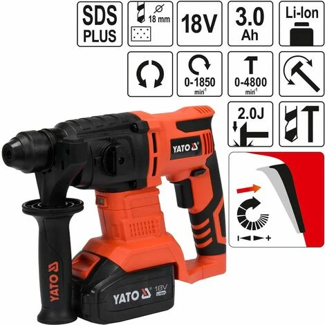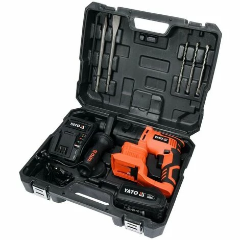 Leichter und ergonomischer Akku-Schlagbohrmaschine SDS-plus YATO mit Schlagfunktion. Dank seines geringen Gewichts, seines kurzen Körpers und seiner Batterieversorgung ist der SDS-plus YATO ideal für Zwischendecken und Reihenbohrungen in Beton. Empfohlen für Installateure, Elektriker.
