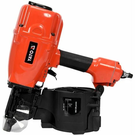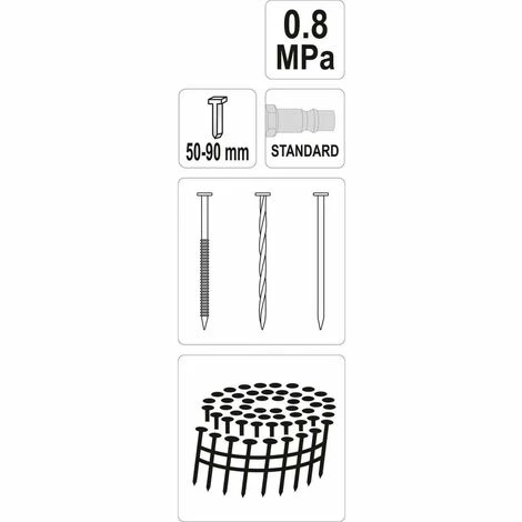 Mit dem YATO Profi Druckluft Nagler können Sie gebundene Coilnägel mit einer Länge von 22 mm bis zu 90 mm verarbeiten. Es können Nägel mit Ring-, Schraub- oder glattem Schaft verarbeitet werden.