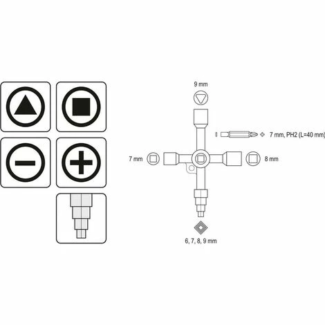 In der Mitte des Schlüssels befindet sich ein 5 mm Quadratloch mit Seitenflächen. Der Schlüssel ist mit einem kettenaufgehängten Adapter, mit einem 7 mm flachen Ph2-Profilbohrer, auf beiden Seiten ausgestattet.