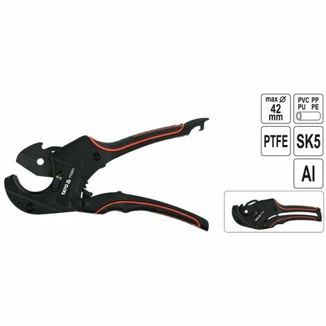 - Schere zum Schneiden von Rohren aus PVC und anderen Kunststoffen (PP, PE, PU) und Leerrohren.