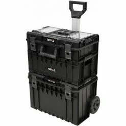 Das aus 3 Modulen bestehende mobile Werkzeugkisten-Set YT-09161 ermöglicht eine sichere und bequeme Werkzeuglagerung und einen einfachen Transport im beladenen Zustand. Das Set ist zusammengesetzt aus einer Basiskiste auf Rädern mit Teleskopgriff, einem Container und eine weiteren Werkzeugbox. Die Module lassen sich mit seitlichen Clipsen sicher verbinden. Diverse Kleinteil-Organizer, zum Teil auch an einer Werkzeugbank aufhängbar, sorgen für den richtigen Überblick. Die obere Werkzeugbox kann als Tritt mit bis zu 120 kg Traglast verwendet werden.